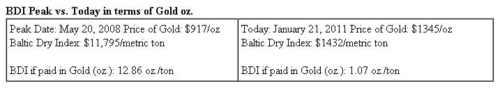 Based on the above, the BDI indicates a shrinkage of demand to the just a tick over 8% of what it was on May 20, 2008. The real question is how can this be used as a baseline going forward. An astute investor can use a similar calculation to determine that the real value of the Dow is not as it seems due, again, to the inflationary value of the USD upon which all stocks on that exchange predicate there reported values. We live in a global economy and using a benchmark that eliminates distortions of fiat currencies, intense media forces, gyrations and manipulation is critical to an entrepreneur making start-up or ongoing strategy plans into the future.